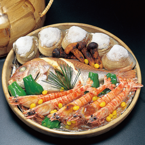 素焼きの器に小石を並べ、瀬戸内海で獲れた魚介類を豪快に盛りつけて焼き上げる郷土料理。村上海賊の武器であった「ほうろく」にちなんだ料理で、戦勝祝いに食したと伝えられている。