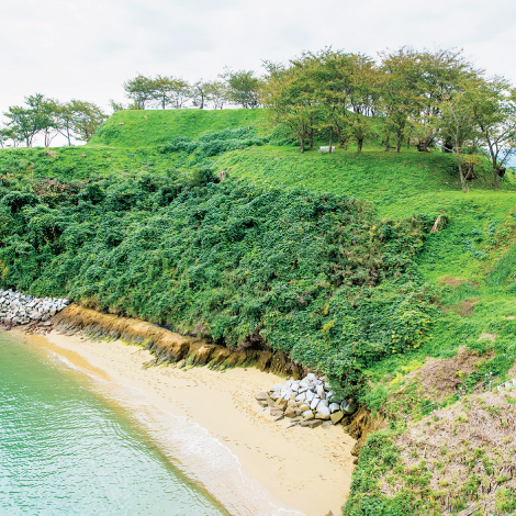 南北朝時代から戦国期にかけて、能島村上氏が居城した代表的な海城の跡。周囲は潮流が渦巻く最大の難所であり、能島は天然の要塞とも言える城だった。岩礁には船をつなぐための柱穴が残る。