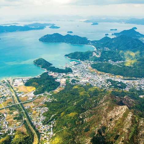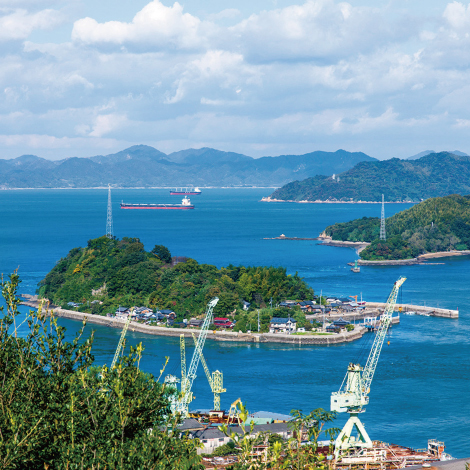 村上海賊が本拠地とした芸予諸島の中で最大の島であり、島の中央にそびえる鷲ヶ頭山の眼下に広がるのは、多島美を象徴する絶景。島内には、村上海賊が氏神として崇めた大山祇神社が鎮座する。