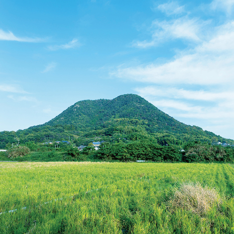 大島のほぼ中央部にある標高215mの八幡山。頂上からは、大三島や波止浜をはじめ、村上海賊が活躍した瀬戸内海一帯の島々を眺めることができる。八合目には巨大な天狗岩、山麓には弥生時代の遺跡や古墳もある。