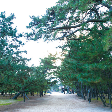 伊予国から燧灘をのぞむ海岸に、幾千もの松が生い茂る景勝地。日本の白砂青松100選にも選ばれている。燧灘で嵐に遭った菅原道真公が、この地に上陸した伝説が語り継がれている。