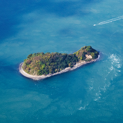 村上海賊が闊歩した島々の景観を代表する景勝地。瓢箪のような島の形から、その名がついた瓢箪島。大三島と生口島の間にあり、それぞれの島の神様が瓢箪島に綱をかけて引き合ったため、中央がくびれてしまったという伝説がある。 ※一般公開されていませんので、遠景でご見学ください。